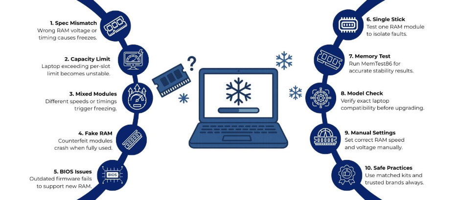 Most freezing issues after a laptop RAM upgrade stem from five core problems: