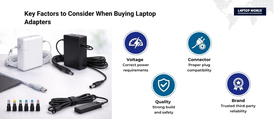 By considering voltage, connector type, build quality, and your laptop usage, you can make an informed decision that meets your needs. Need the perfect laptop adapter? Visit Laptop World in Malleshwaram for original and certified compatible laptop adapters.